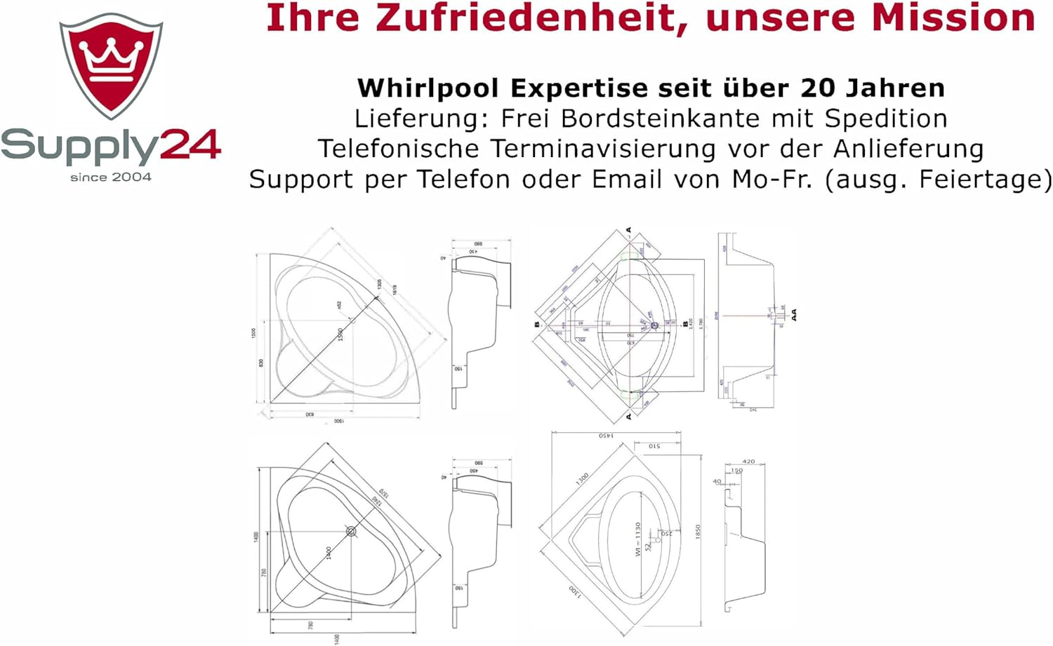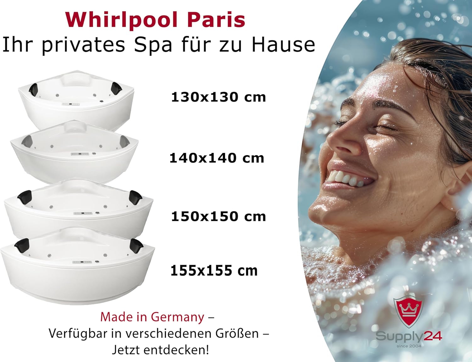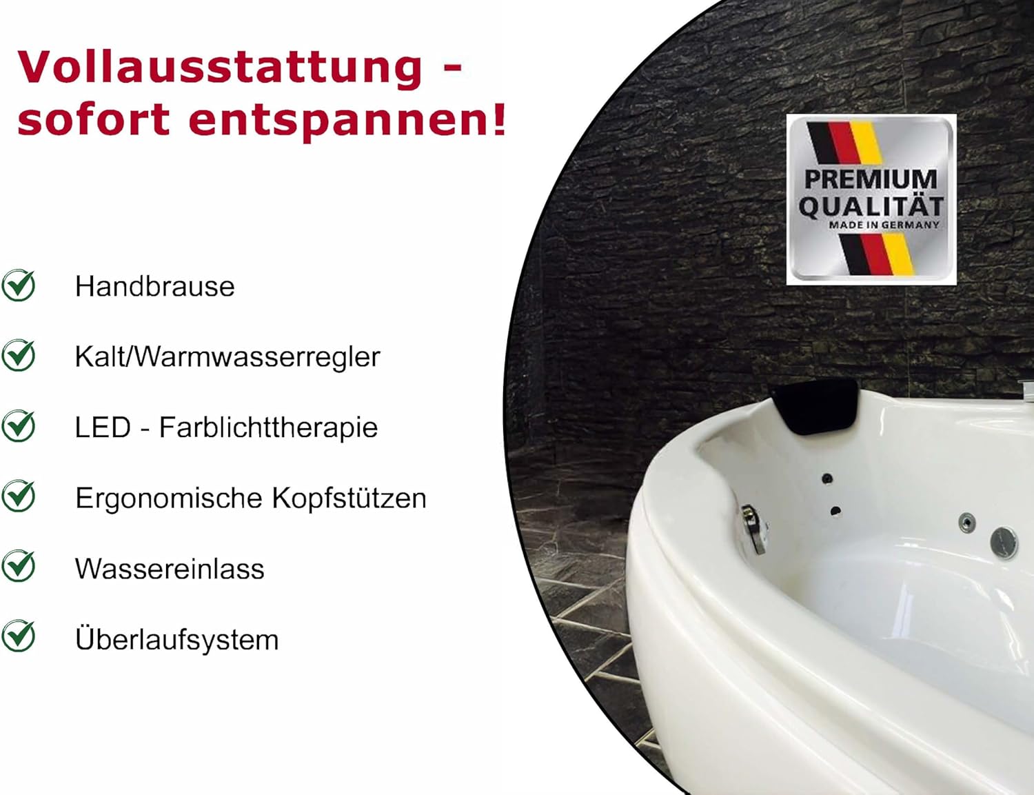 Whirlpool-Badewanne Paris MADE IN GERMANY Mit 8 Massagedüsen + LED-Unterwasserbeleuchtung / Licht + Balboa + OHNE Whirlpool Eckbadewanne Armaturen Spa Runde Eckbadewanne Intra Preiswert