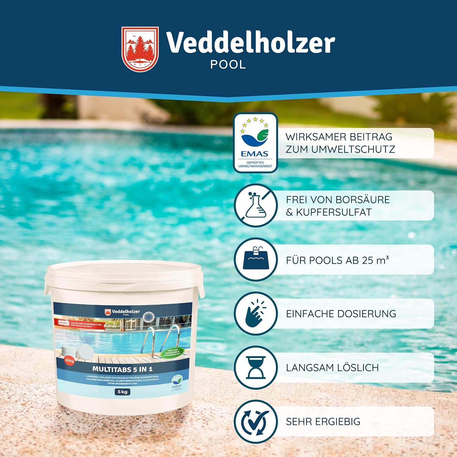 Veddelholzer 5 kg Multitabs 5 in 1 Chlorine Tablets for Pool as 200 g Tablets for Large Pools from 25 m³ Pool Accessories for Pools Slow Dissolving, Long-Term Chlorine Tablets